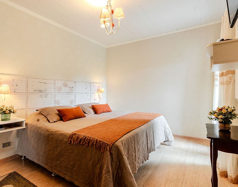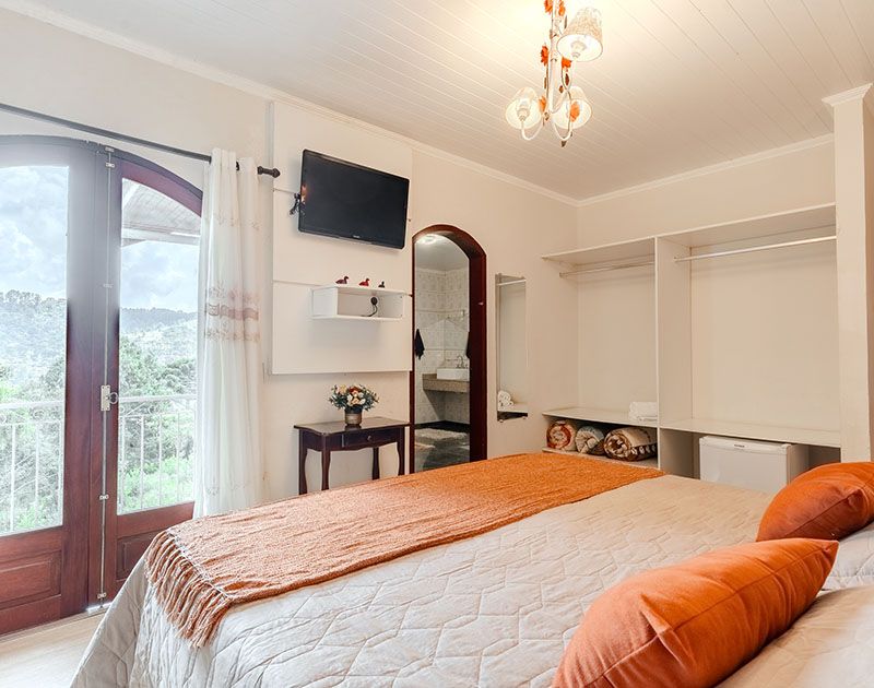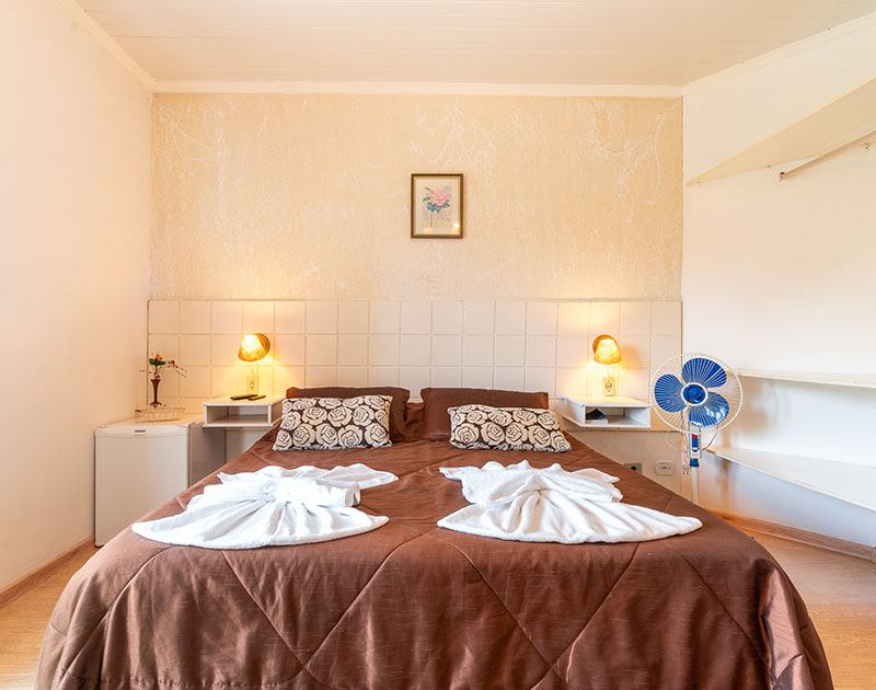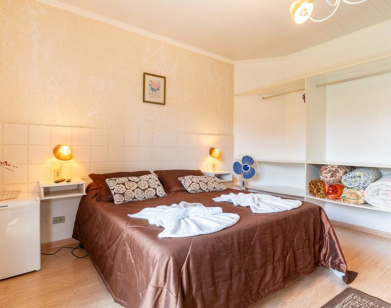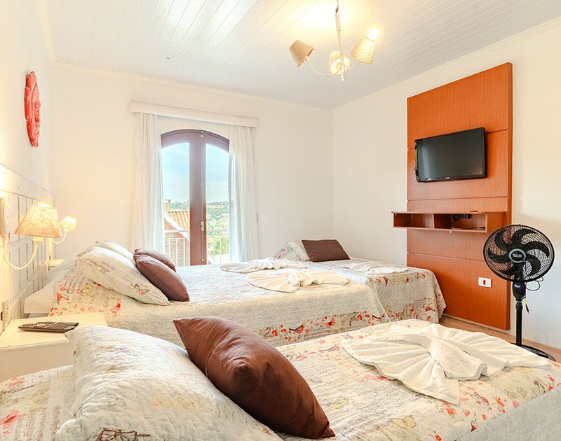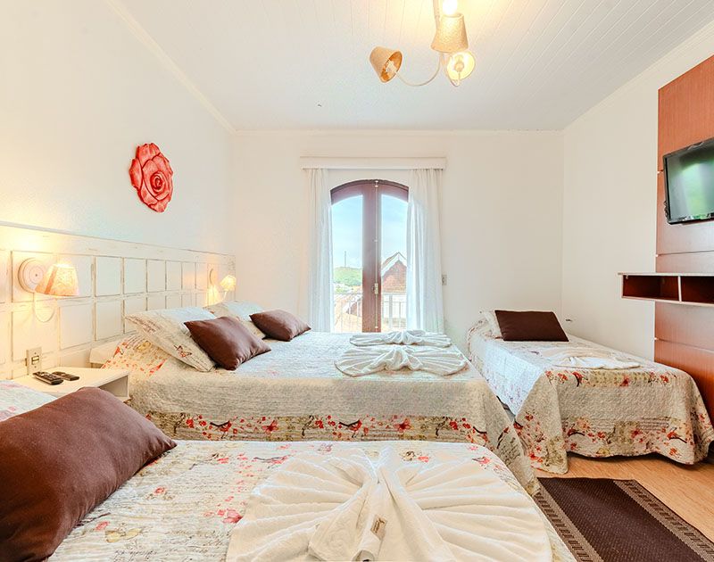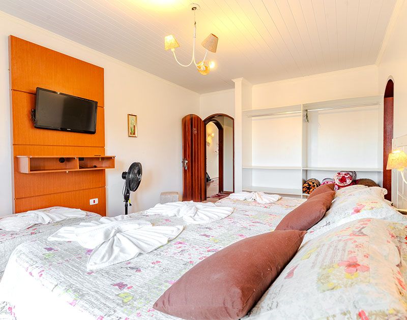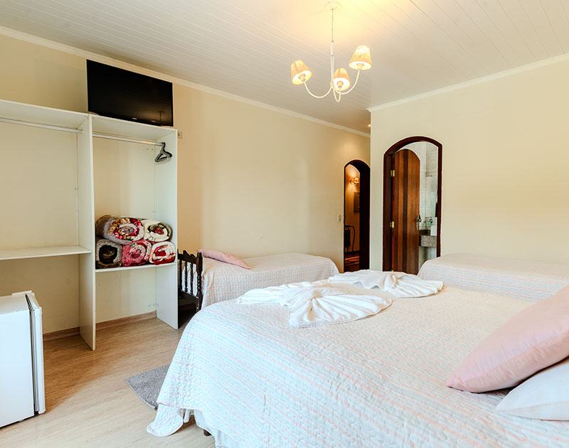 Quartos ótimos para 3 pessoas com excelente espaço interno e conforto. Todos possuem 1 cama de casal e 1 cama de solteiro. Possuem também TV LED, Wifi com acesso gratuito, frigobar e aquecedor.