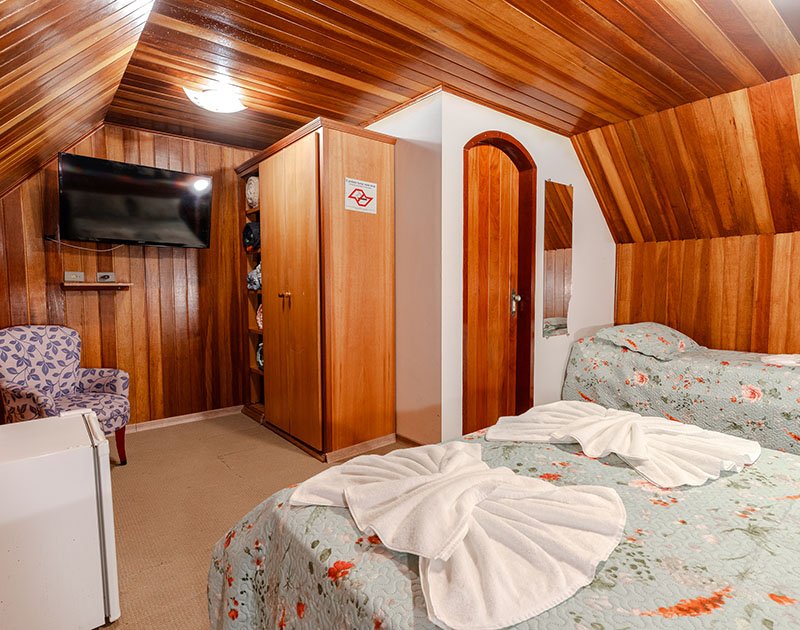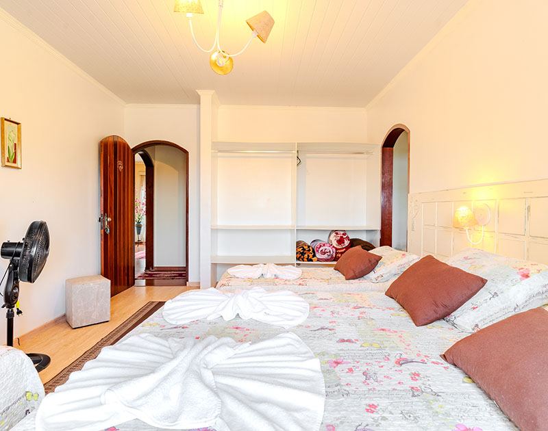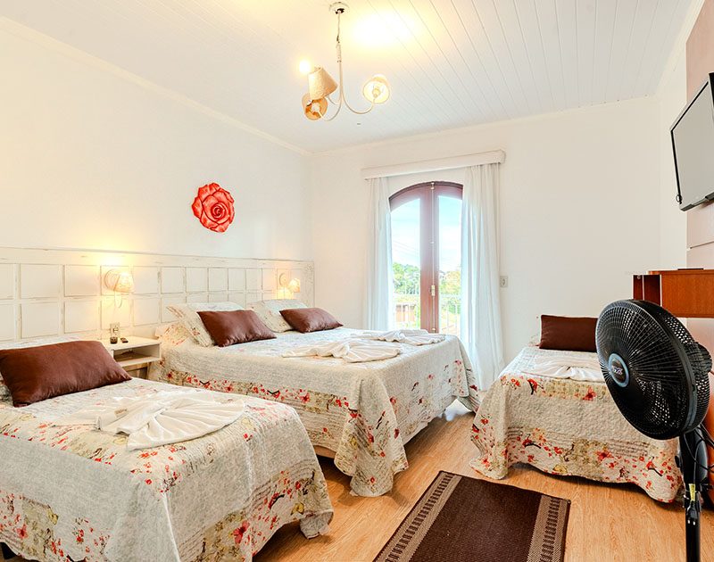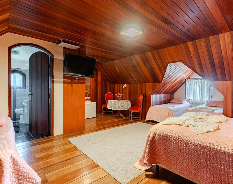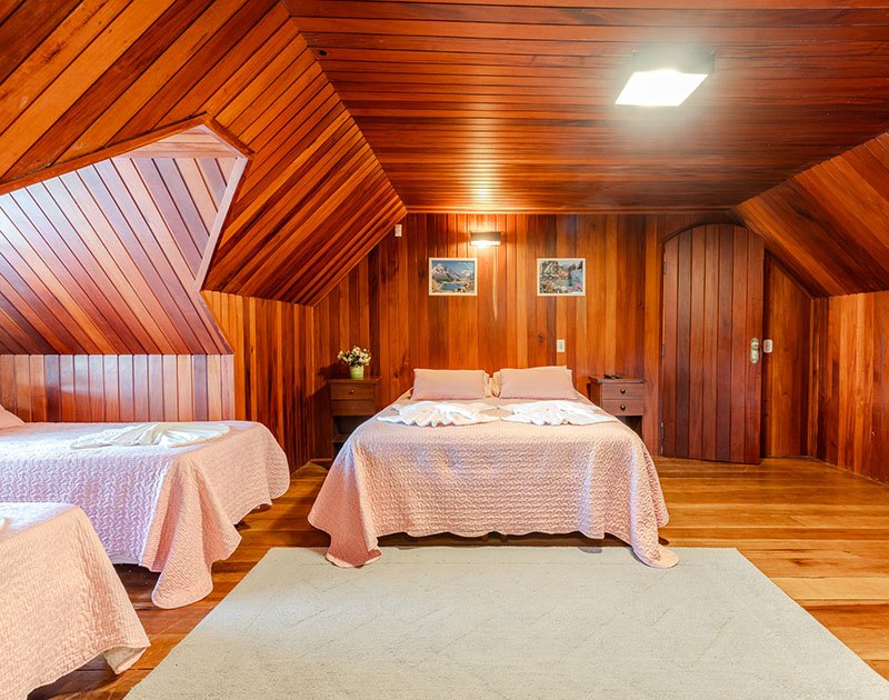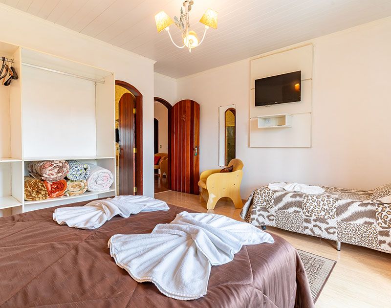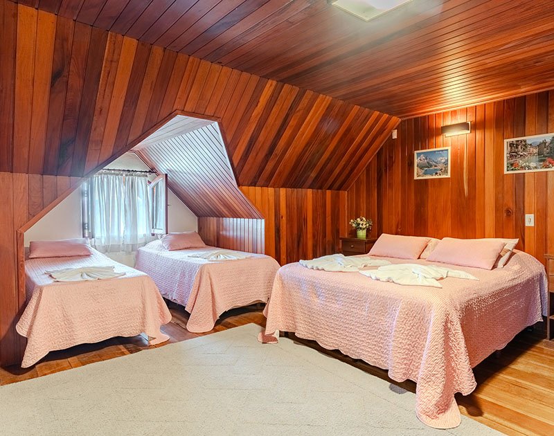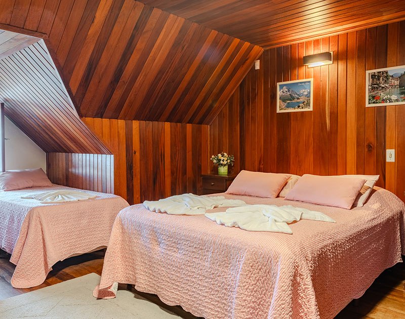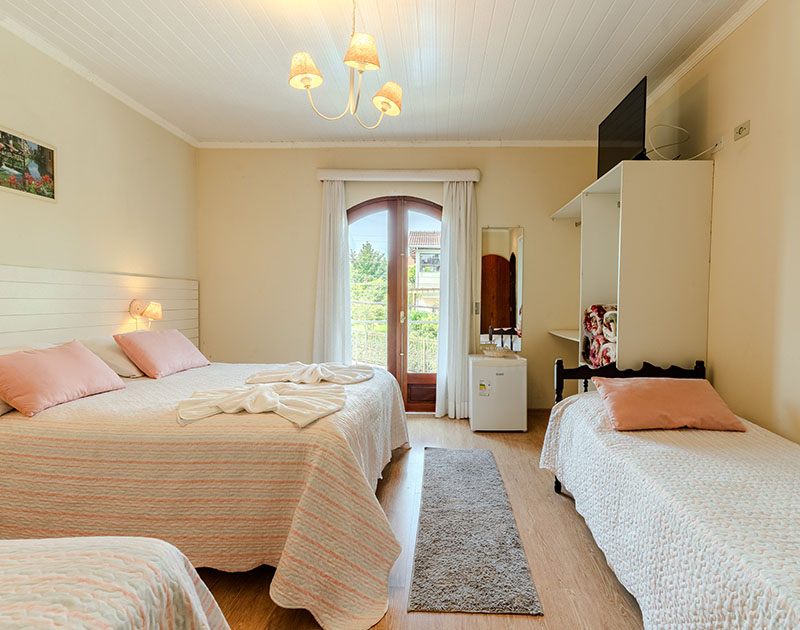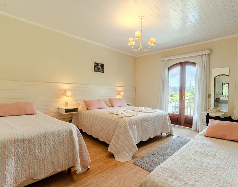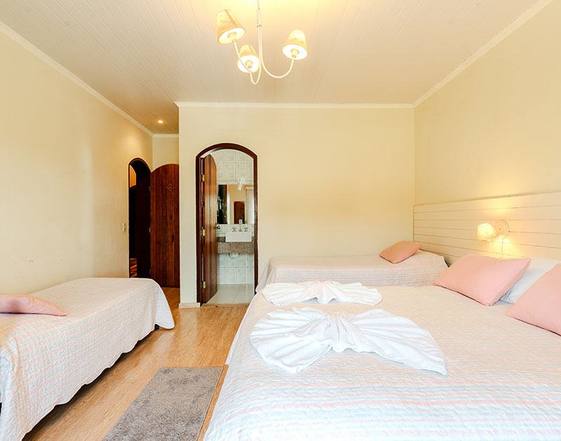 Quartos perfeitos para 4 pessoas (casal e crianças ou 4 adultos). Todos possuem 1 cama de casal e 2 camas de solteiro. Possuem também TV LED, Wifi com acesso gratuito, frigobar e aquecedor.